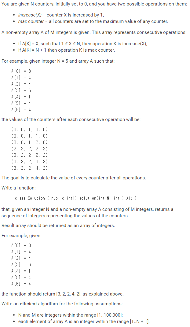 배열 A와 숫자 N이 주어지는데, A[K] 값이 1과 N 사이라면 counter의 X 위치를 1 더하고, A[K] 값이 N+1이면 counter의 최대값으로 모든 값들을 세팅해주는 식으로 해서 배열 A를 돌면서 모든 연산을 처리한 결과를 반환하는 문제.