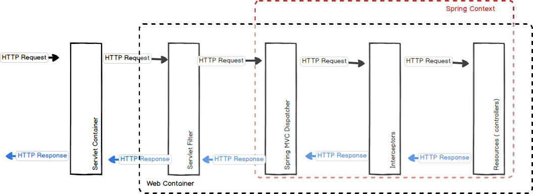 서블릿 컨테이너에서 요청을 받은 경우 (DispatcherServlet이 받기전에) 먼저 filter를 타고, 그 후에 DispatcherServlet이 그 요청을 받아서 매핑되는 handler에게 요청을 전달하기 전에 interceptor가 intercept함.